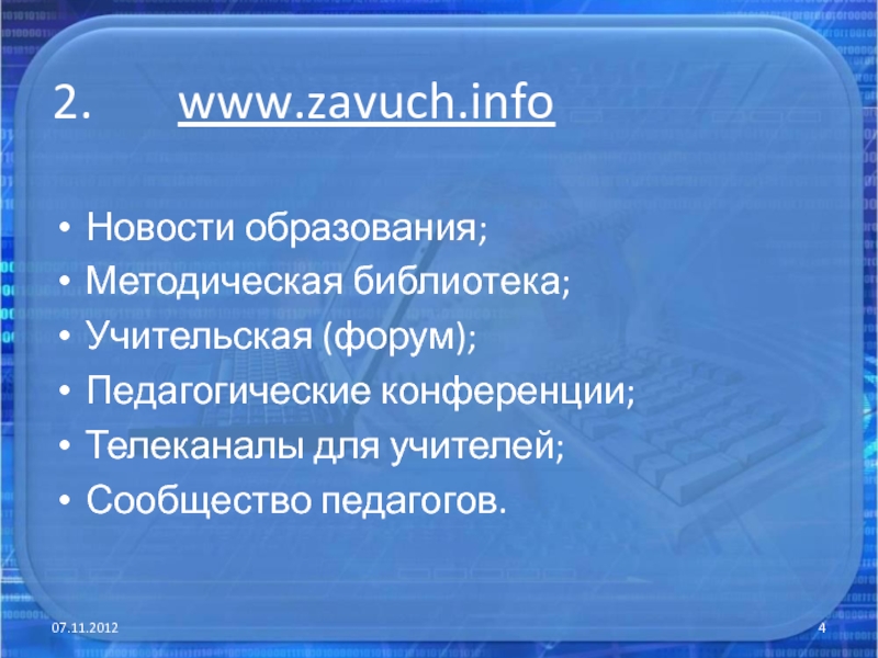 2.    www.zavuch.infoНовости образования;Методическая библиотека;Учительская (форум);Педагогические конференции;Телеканалы для учителей;Сообщество педагогов.