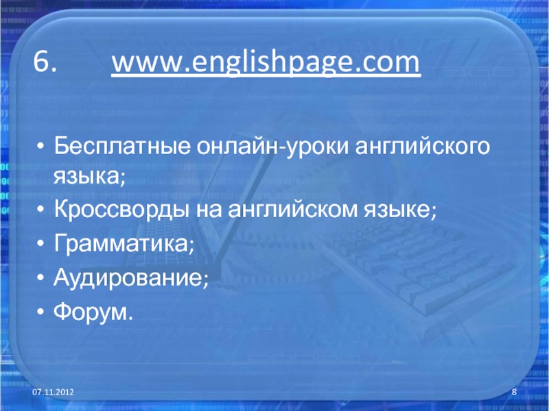 6.    www.englishpage.comБесплатные онлайн-уроки английского языка;Кроссворды на английском языке;Грамматика;Аудирование;Форум.