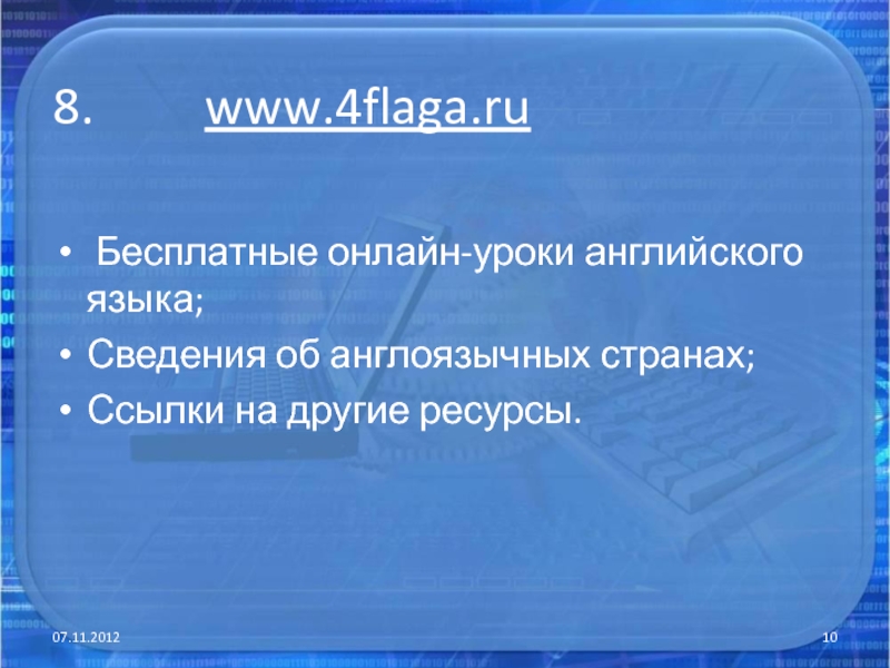 8.     www.4flaga.ru Бесплатные онлайн-уроки английского языка;Сведения об англоязычных странах;Ссылки на другие ресурсы.
