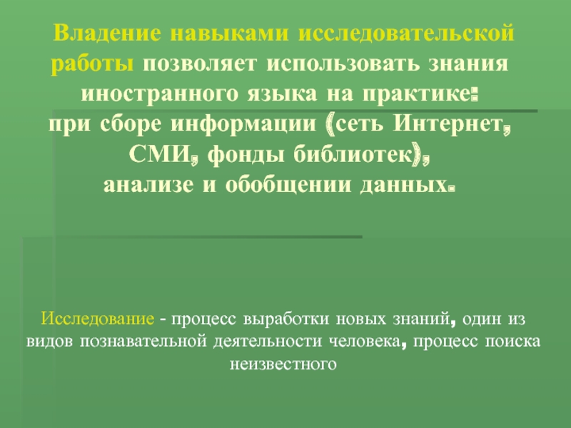 Исследование - процесс выработки новых знаний, один из видов познавательной деятельности человека, процесс поиска неизвестного