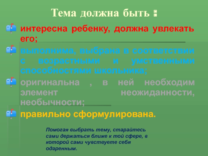Помогая выбрать тему, старайтесь сами держаться ближе к той сфере, в которой сами чувствуете себя одаренным.