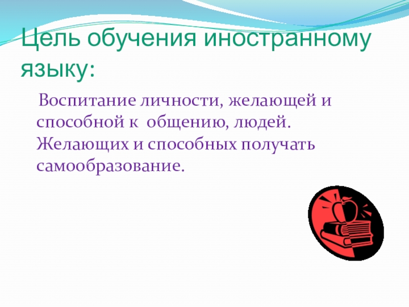 Цель обучения иностранному языку: Воспитание личности, желающей и способной к общению, людей. Желающих и способных получать самообразование.