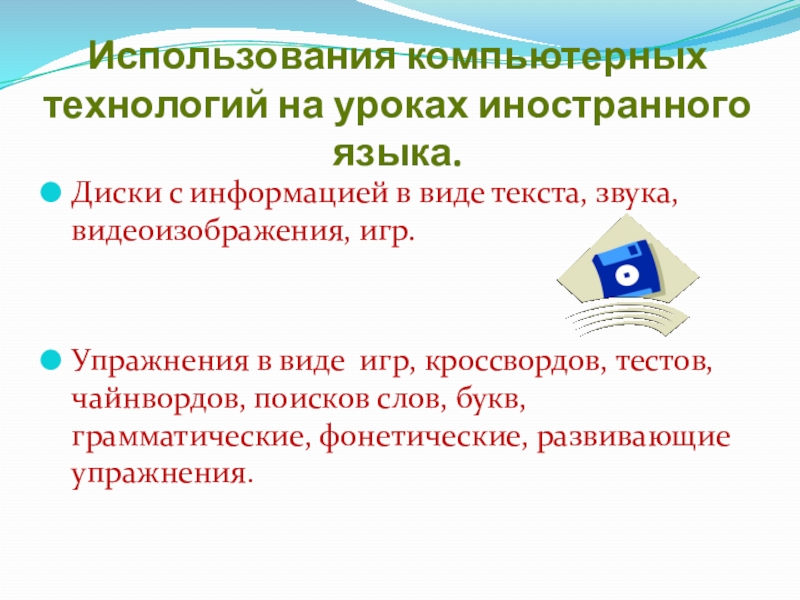 Использования компьютерных технологий на уроках иностранного языка.Диски с информацией в виде текста, звука, видеоизображения, игр.Упражнения в виде