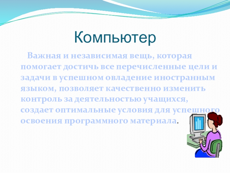 Компьютер   Важная и независимая вещь, которая помогает достичь все перечисленные цели и задачи в успешном