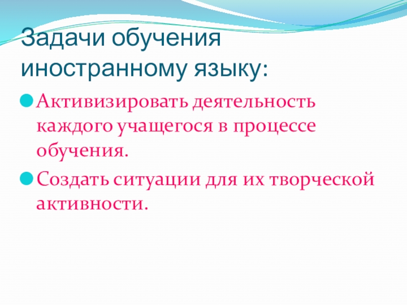 Задачи обучения иностранному языку:Активизировать деятельность каждого учащегося в процессе обучения.Создать ситуации для их творческой активности.