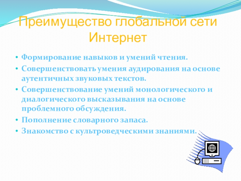 Преимущество глобальной сети ИнтернетФормирование навыков и умений чтения.Совершенствовать умения аудирования на основе аутентичных звуковых текстов.Совершенствование умений монологического