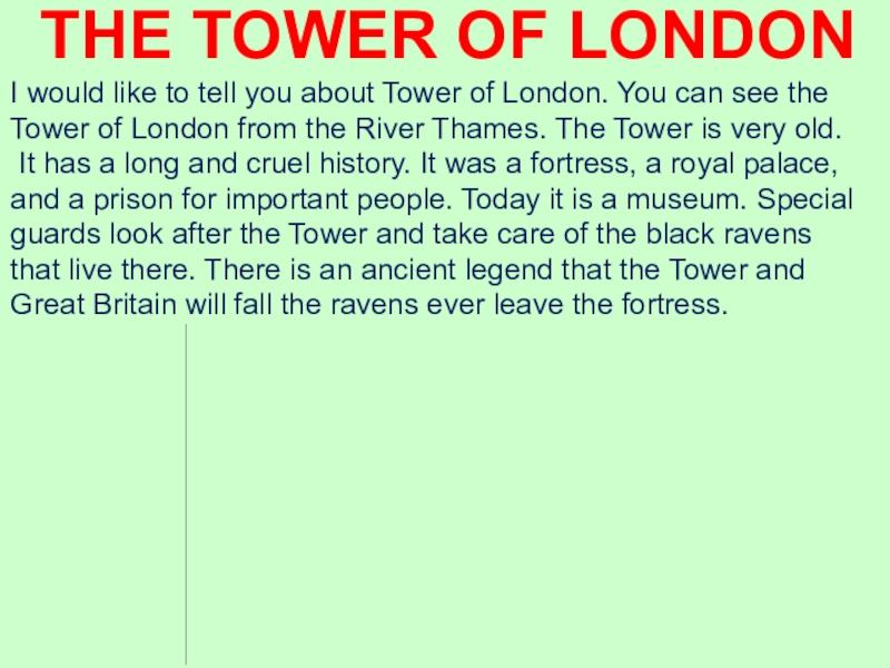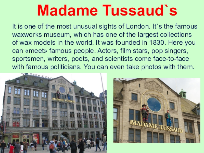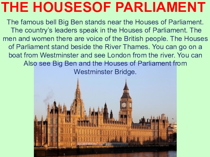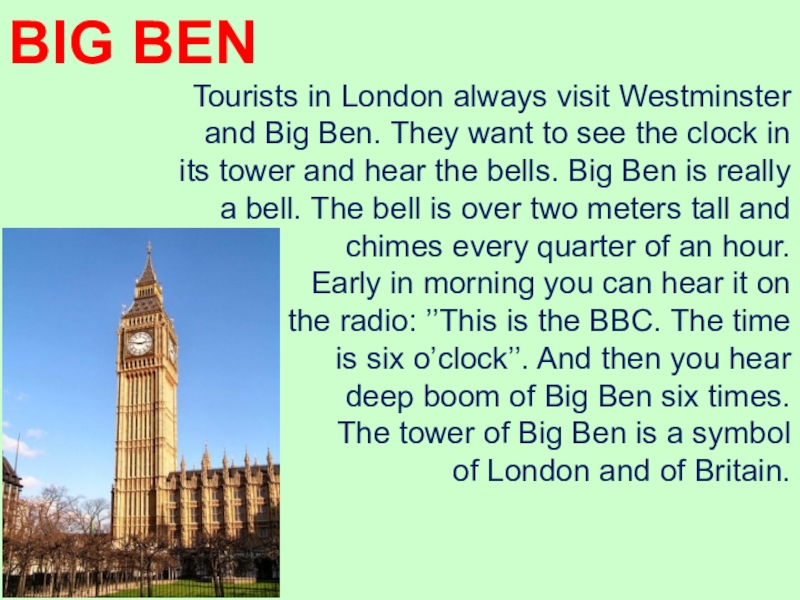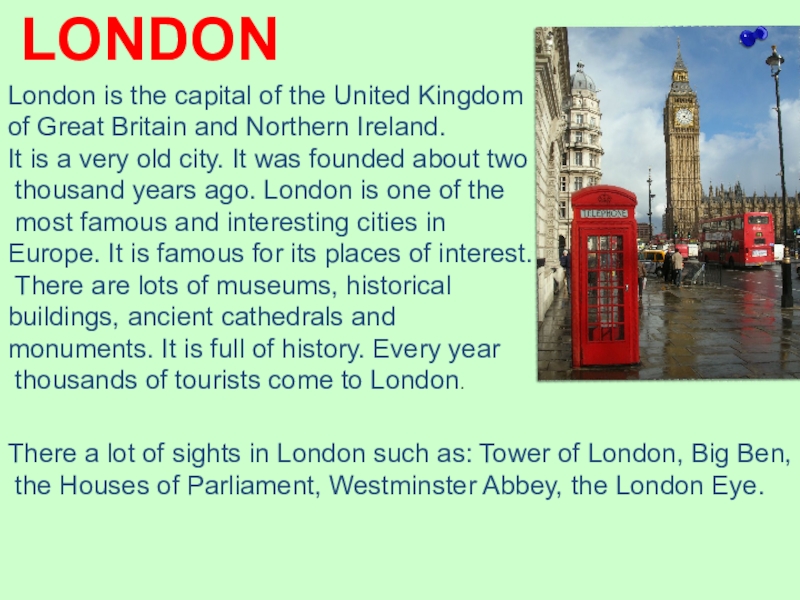 There a lot of sights in London such as: Tower of London, Big Ben,