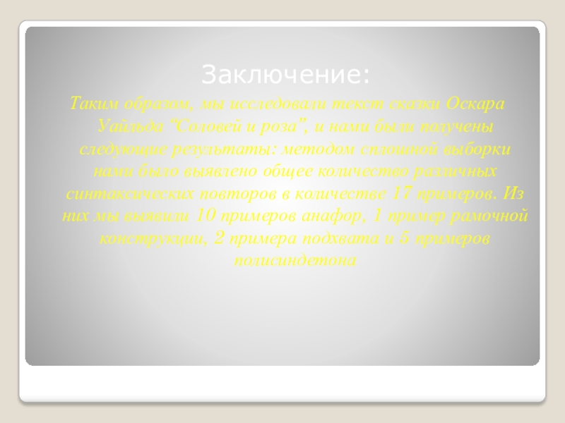 Таким образом, мы исследовали текст сказки Оскара Уайльда “Соловей и роза”,