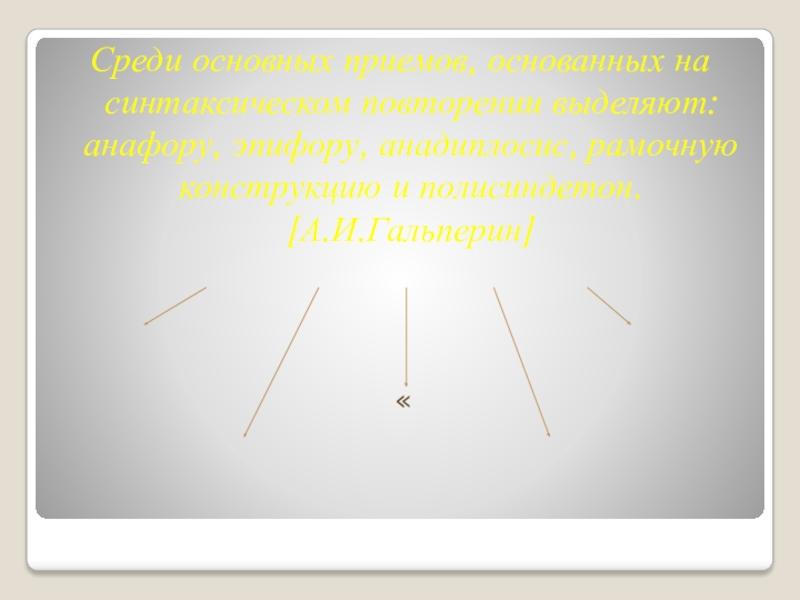 Слайд 5Среди основных приемов, основанных на синтаксическом повторении выделяют: анафору, эпифору, анадиплосис,