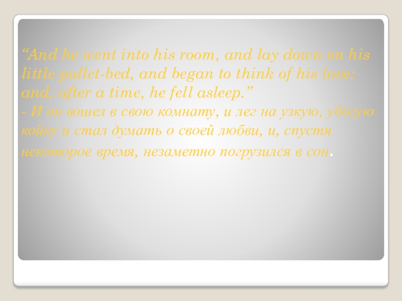 - И он вошел в свою комнату, и лег на узкую, убогую койку и стал думать о своей любви, и, спустя некоторое время, незаметно погрузился в сон.