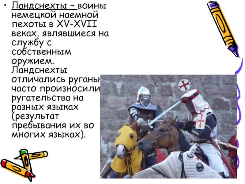 службу с собственным оружием. Ландснехты отличались руганью, часто произносили ругательства на разных языках (результат пребывания их во многих языках).