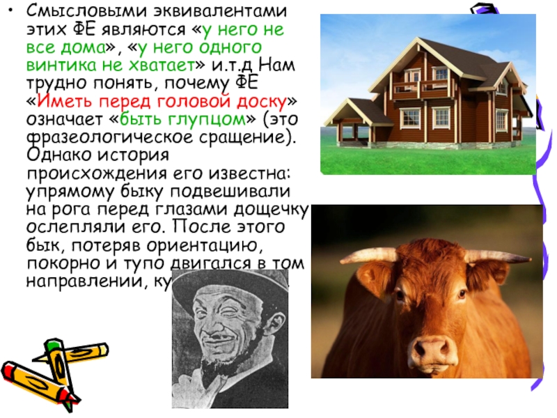 него одного винтика не хватает» и.т.д Нам трудно понять, почему ФЕ «Иметь перед головой доску» означает «быть глупцом» (это фразеологическое сращение). Однако история происхождения его известна: упрямому быку подвешивали на рога перед глазами дощечку, ослепляли его. После этого бык, потеряв ориентацию, покорно и тупо двигался в том направлении, куда его гнали.