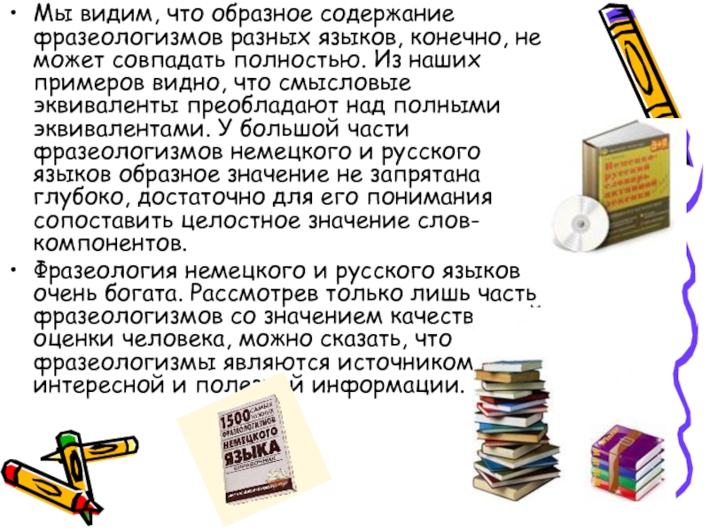 Фразеология немецкого и русского языков очень богата. Рассмотрев только лишь часть фразеологизмов со значением качественной оценки человека, можно сказать, что фразеологизмы являются источником интересной и полезной информации.
