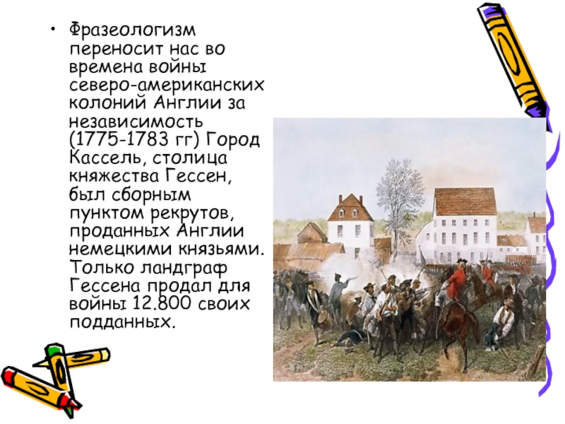 (1775-1783 гг) Город Кассель, столица княжества Гессен, был сборным пунктом рекрутов, проданных Англии немецкими князьями. Только ландграф Гессена продал для войны 12.800 своих подданных.