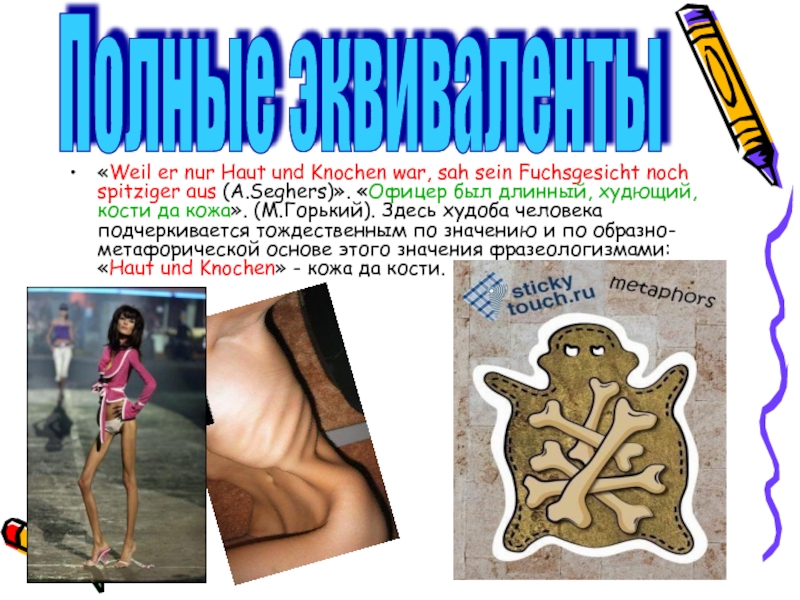 spitziger aus (A.Seghers)». «Офицер был длинный, худющий, кости да кожа». (М.Горький). Здесь худоба человека подчеркивается тождественным по значению и по образно-метафорической основе этого значения фразеологизмами: «Haut und Knochen» - кожа да кости.