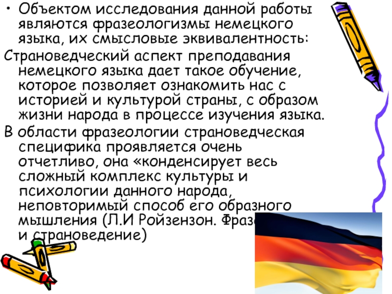 Объектом исследования данной работы являются фразеологизмы немецкого языка, их смысловые эквивалентность: