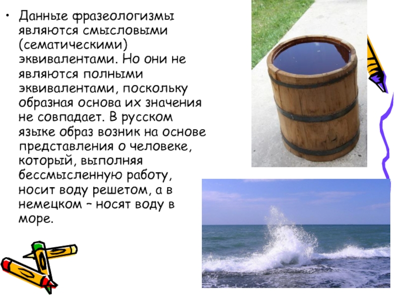 эквивалентами, поскольку образная основа их значения не совпадает. В русском языке образ возник на основе представления о человеке, который, выполняя бессмысленную работу, носит воду решетом, а в немецком – носят воду в море.