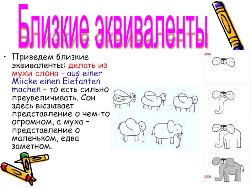 Слайд 15Приведем близкие эквиваленты: делать из мухи слона - aus einer Miicke