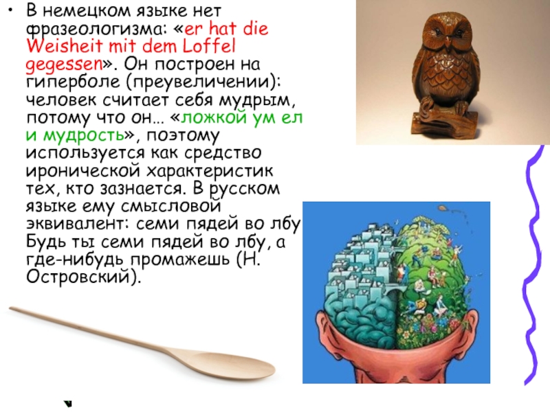 Loffel gegessen». Он построен на гиперболе (преувеличении): человек считает себя мудрым, потому что он… «ложкой ум ел и мудрость», поэтому используется как средство иронической характеристик тех, кто зазнается. В русском языке ему смысловой эквивалент: семи пядей во лбу. Будь ты семи пядей во лбу, а где-нибудь промажешь (Н.Островский).