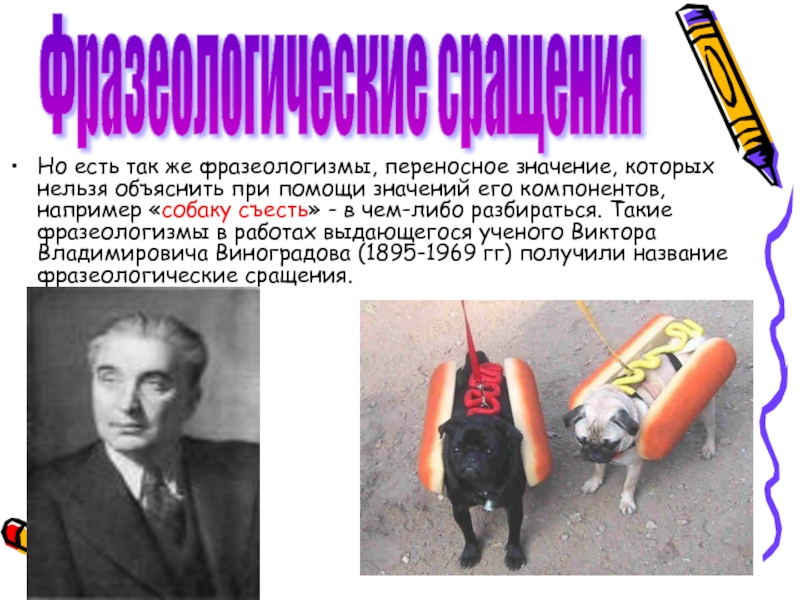 помощи значений его компонентов, например «собаку съесть» - в чем-либо разбираться. Такие фразеологизмы в работах выдающегося ученого Виктора Владимировича Виноградова (1895-1969 гг) получили название фразеологические сращения.