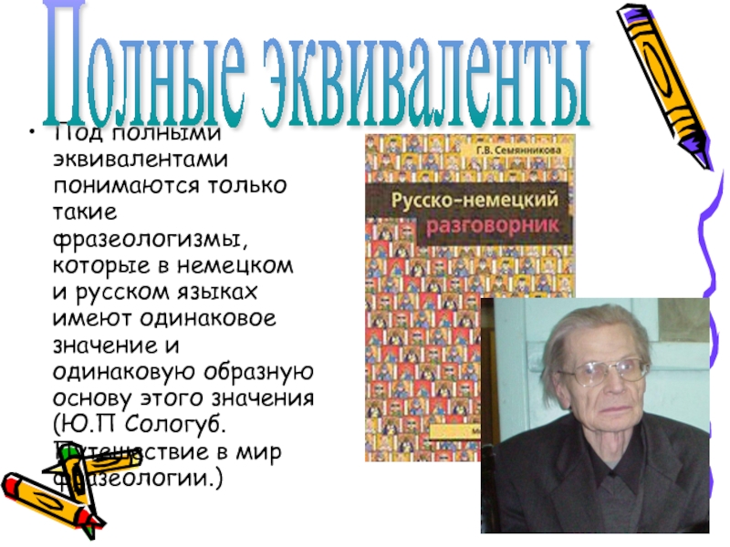 Слайд 13Под полными эквивалентами понимаются только такие фразеологизмы, которые в немецком и