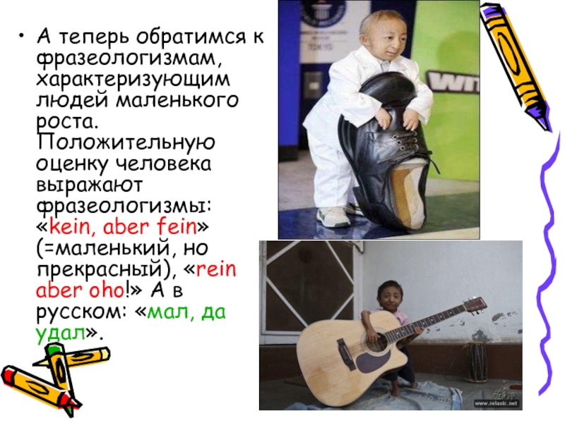 человека выражают фразеологизмы: «kein, aber fein» (=маленький, но прекрасный), «rein aber oho!» А в русском: «мал, да удал».