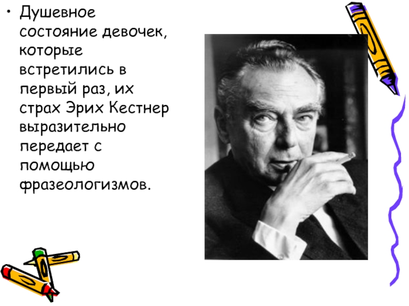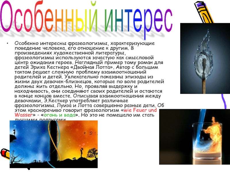 произведениях художественной литературы, фразеологизмы используются зачастую как смысловой центр ожидания героев. Наглядный пример тому роман для детей Эриха Кестнера «Двойная Лотта». Автор с большим тактом решает сложную проблему взаимоотношений родителей и детей. Увлекательно показаны эпизоды из жизни двух девочек-близнецов, которые по воле родителей должны жить отдельно. Но, проявляя выдержку и находчивость, они соединяют своих родителей и остаются в конце концов вместе. Описывая взаимоотношения между девочками, Э.Кестнер употребляет различные фразеологизмы. Луиза и Лотта совершенно разные дети. Об этом красноречиво говорит фразеологизм «wie Feuer und Wasser» - «огонь и вода». Но это не помешало им стать лучшими подругами.