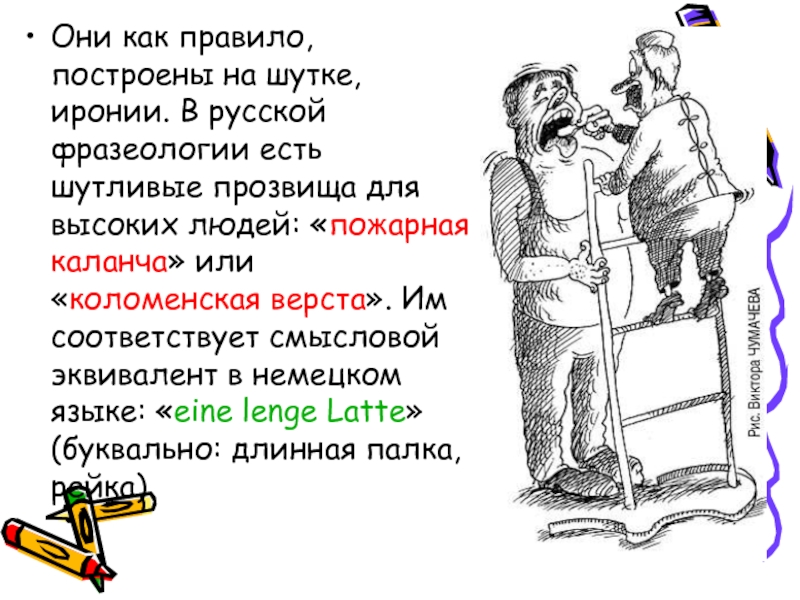 шутливые прозвища для высоких людей: «пожарная каланча» или «коломенская верста». Им соответствует смысловой эквивалент в немецком языке: «eine lenge Latte» (буквально: длинная палка, рейка)