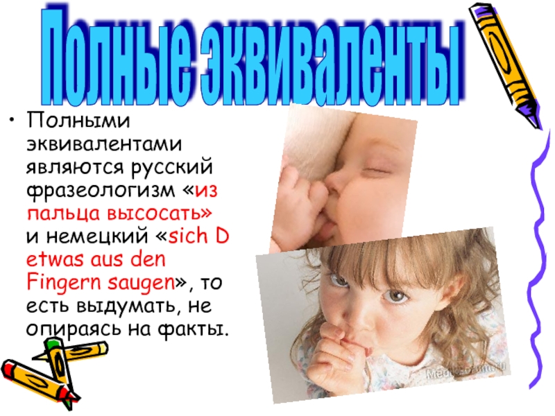 Слайд 14Полными эквивалентами являются русский фразеологизм «из пальца высосать» и немецкий «sich