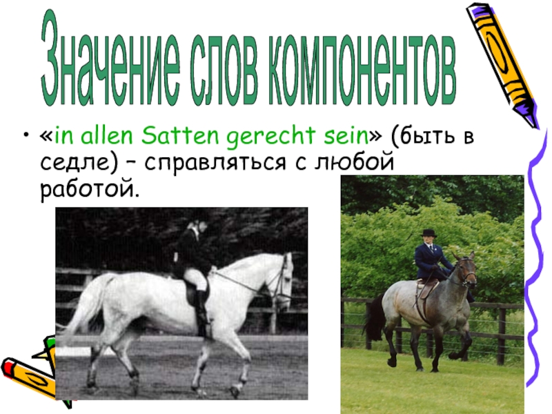 Слайд 18«in allen Satten gerecht sein» (быть в седле) – справляться с