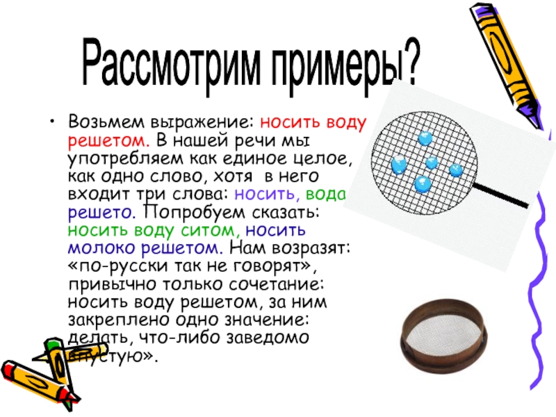 Возьмем выражение: носить воду решетом. В нашей речи мы употребляем как