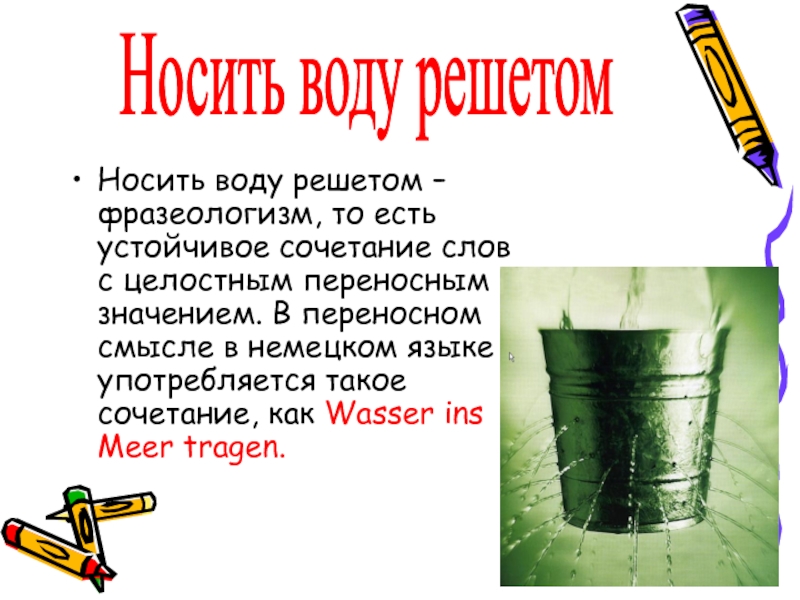 целостным переносным значением. В переносном смысле в немецком языке употребляется такое сочетание, как Wasser ins Meer tragen.
