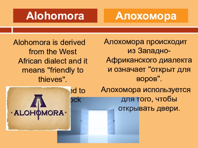 Алохомора происходит из Западно-Африканского диалекта и означает "открыт для воров".