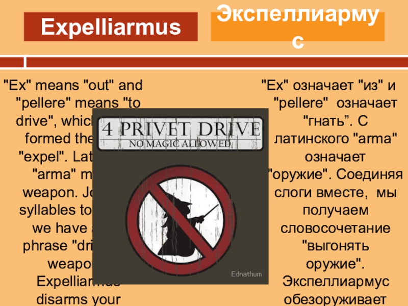 "Ex" означает "из" и "pellere" означает "гнать”. С латинского "arma" означает "оружие". Соединяя слоги вместе, мы получаем словосочетание "выгонять оружие".Экспеллиармус обезоруживает вашего противника.