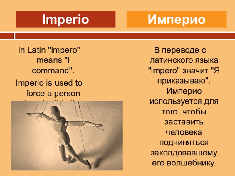 В переводе с латинского языка "impero" значит "Я приказываю". Империо используется для того, чтобы заставить человека подчиняться заколдовавшему его волшебнику.