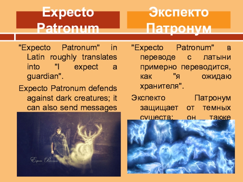 "Expecto Patronum" в переводе с латыни примерно переводится, как "я ожидаю хранителя".