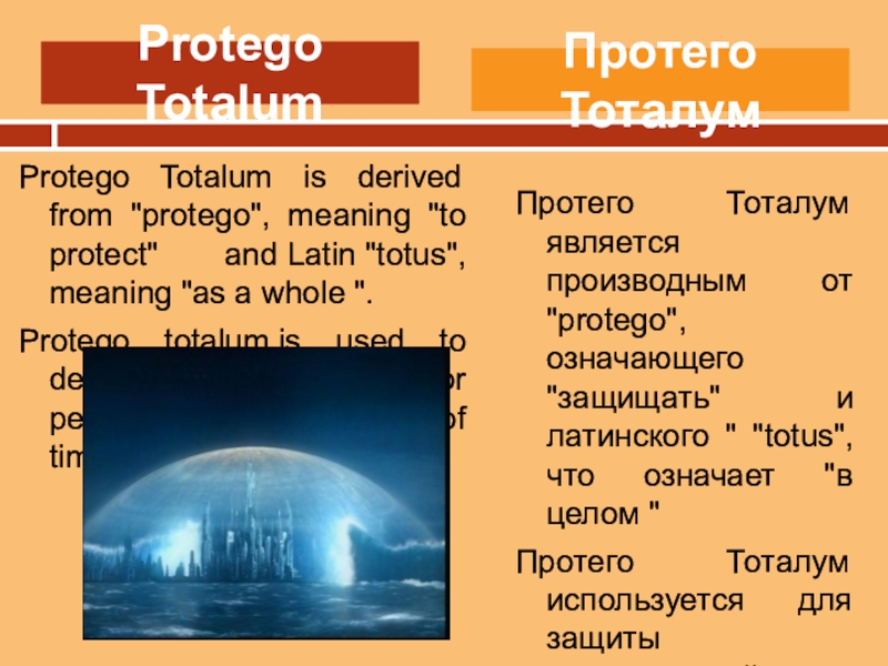 Протего Тоталум является производным от "protego", означающего "защищать" и латинского " "totus", что означает "в целом "