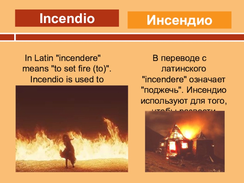 В переводе с латинского "incendere" означает "поджечь". Инсендио используют для того, чтобы развести огонь.
