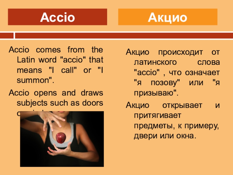 Акцио происходит от латинского слова "accio" , что означает "я позову" или "я призываю".