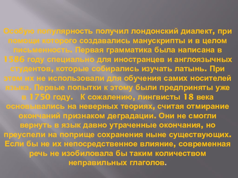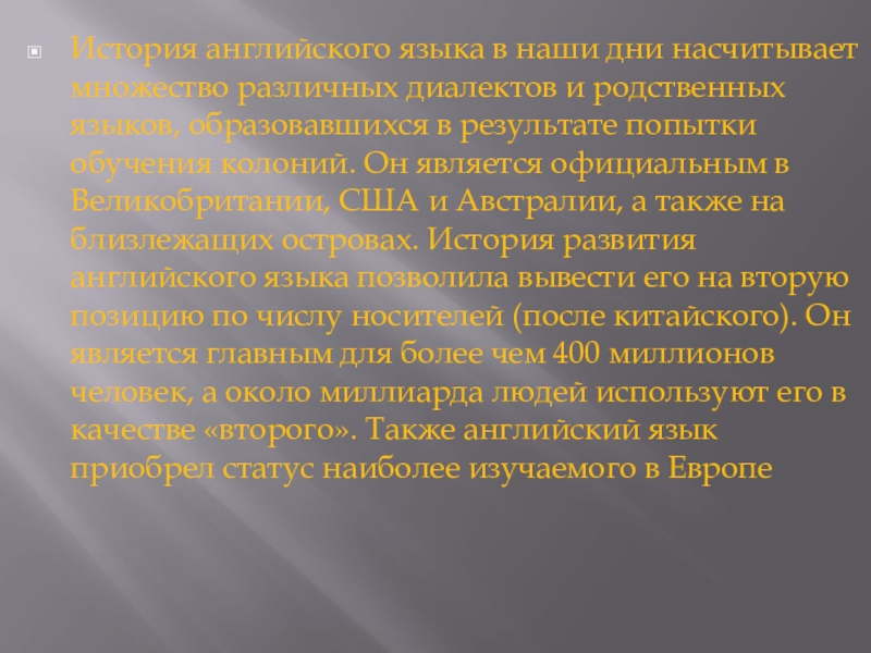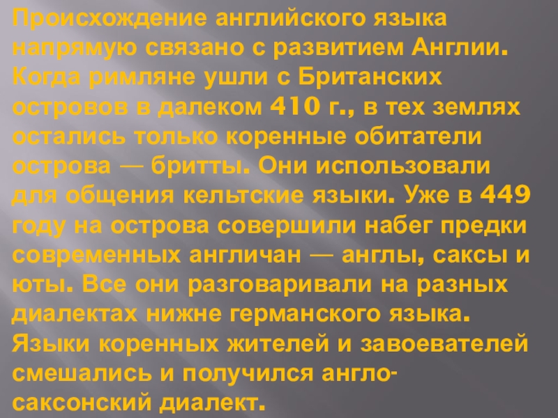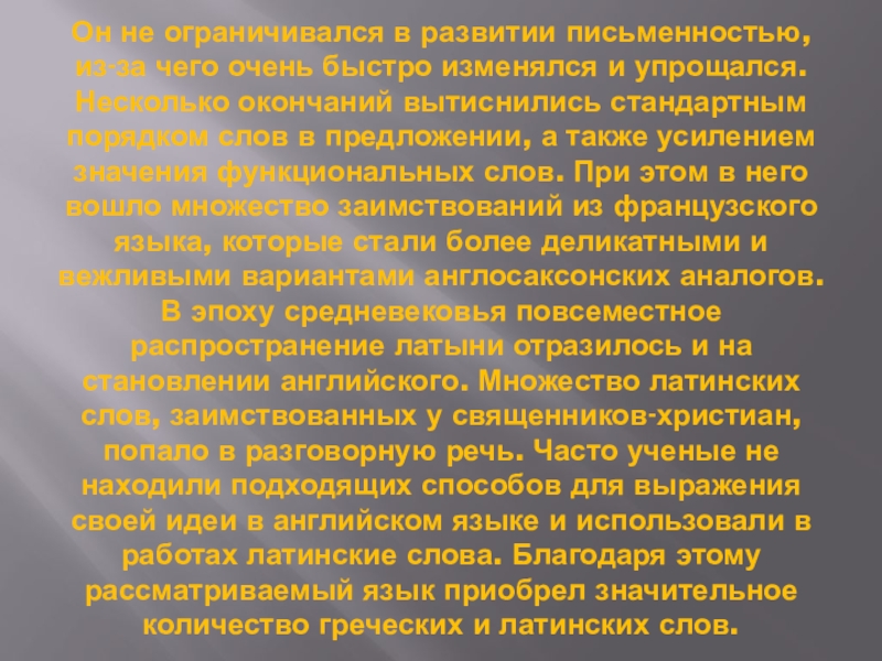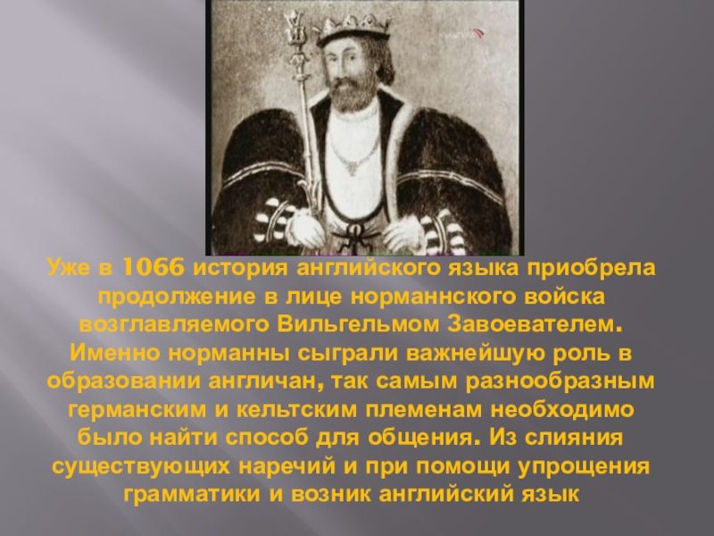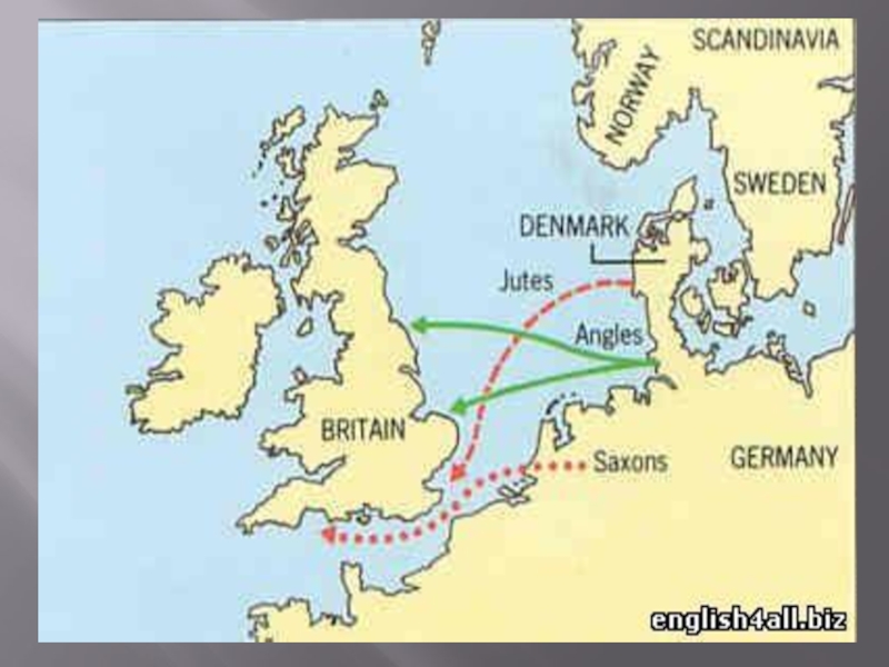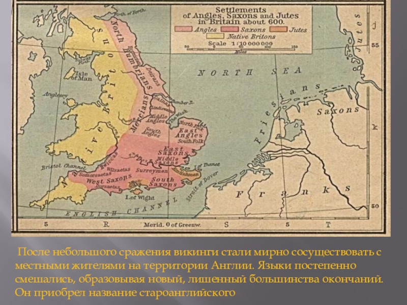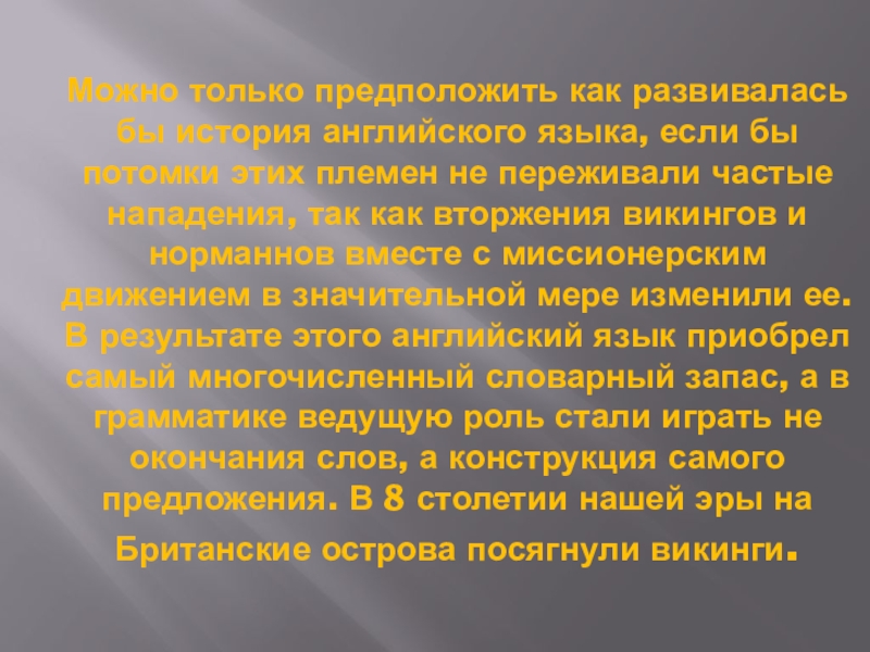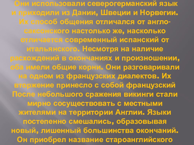 Можно только предположить как развивалась бы история английского языка, если бы потомки этих племен не переживали частые нападения, так как вторжения викингов и норманнов вместе с миссионерским движением в значительной мере изменили ее. В результате этого английский язык приобрел самый многочисленный словарный запас, а в грамматике ведущую роль стали играть не окончания слов, а конструкция самого предложения. В 8 столетии нашей эры на Британские острова посягнули викинги. Они использовали северогерманский язык и приходили из Дании, Швеции и Норвегии. Их способ общения отличался от англо-саксонского настолько же, насколько отличается современный испанский от итальянского. Несмотря на наличие расхождений в окончаниях и произношении, оба имели общие корни.Они разговаривали на одном из французских диалектов. Их вторжение принесло с собой францу После небольшого сражения викинги стали мирно сосуществовать с местными жителями на территории Англии. Языки постепенно смешались, образовывая новый, лишенный большинства окончаний. Он приобрел название староанглийского