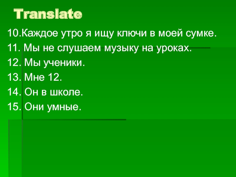 Translate10.Каждое утро я ищу ключи в моей сумке.11. Мы не слушаем музыку на уроках.12. Мы ученики.13. Мне