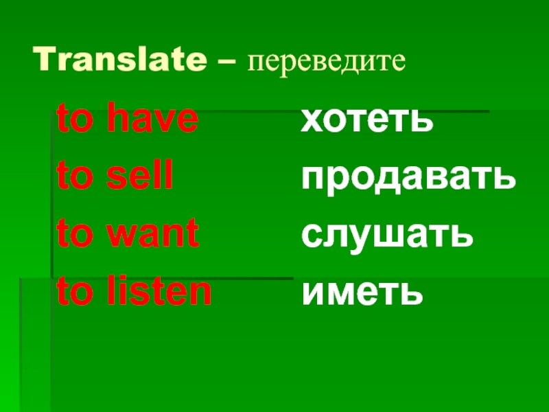 Translate – переведитеto haveto sellto wantto listenхотетьпродаватьслушатьиметь