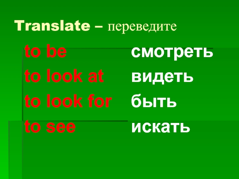 Translate – переведитеto beto look atto look forto seeсмотретьвидетьбытьискать