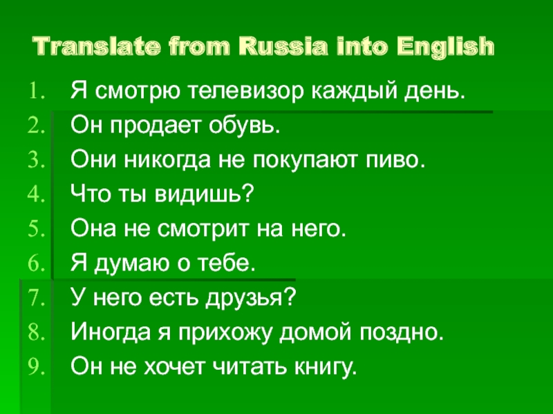 Translate from Russia into EnglishЯ смотрю телевизор каждый день.Он продает обувь.Они никогда не покупают пиво.Что ты видишь?Она