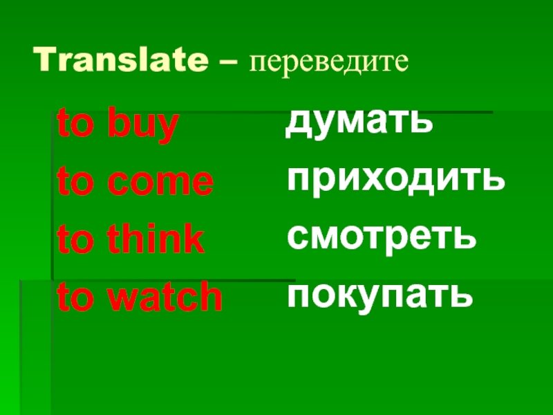 Translate – переведитеto buy    to cometo thinkto watchдуматьприходитьсмотретьпокупать