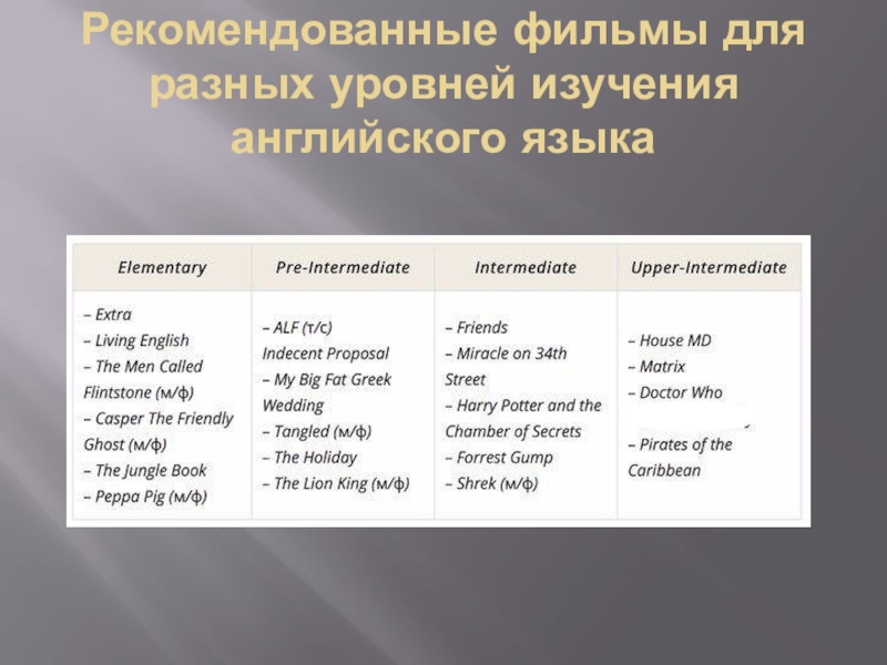 Слайд 4Рекомендованные фильмы для разных уровней изучения английского языка