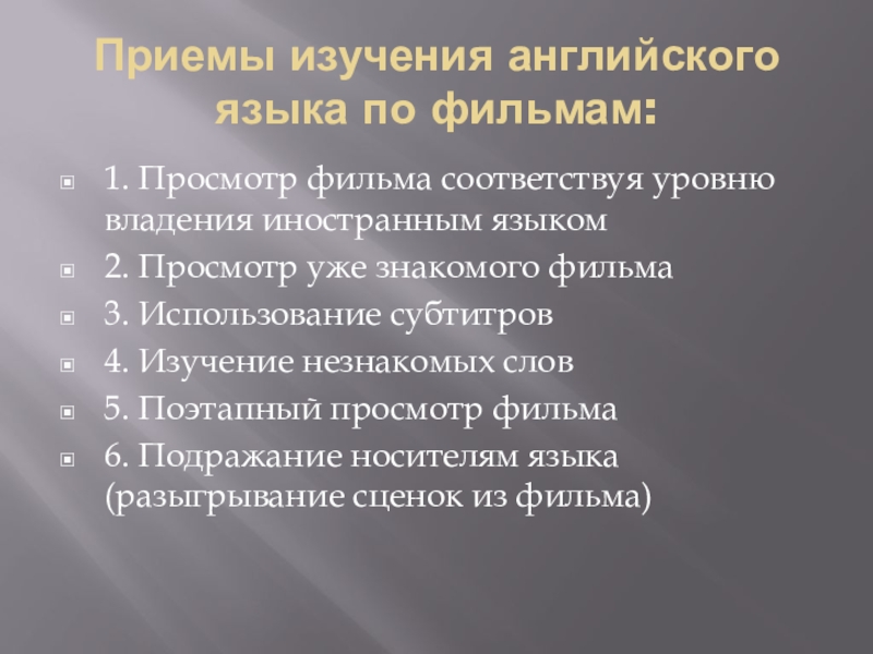 Приемы изучения английского языка по фильмам:1. Просмотр фильма соответствуя уровню владения иностранным языком2. Просмотр уже знакомого фильма3.