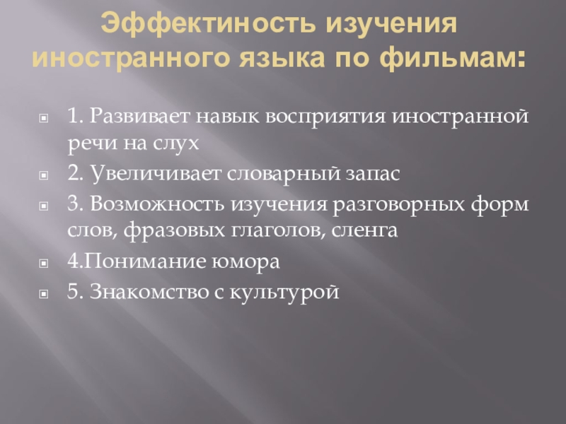 Эффектиность изучения иностранного языка по фильмам:  1. Развивает навык восприятия иностранной речи на слух2. Увеличивает словарный
