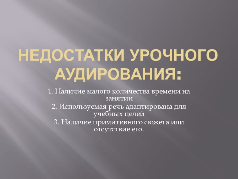 Недостатки урочного аудирования:1. Наличие малого количества времени на занятии2. Используемая речь адаптирована для учебных целей3. Наличие примитивного сюжета или отсутствие его.