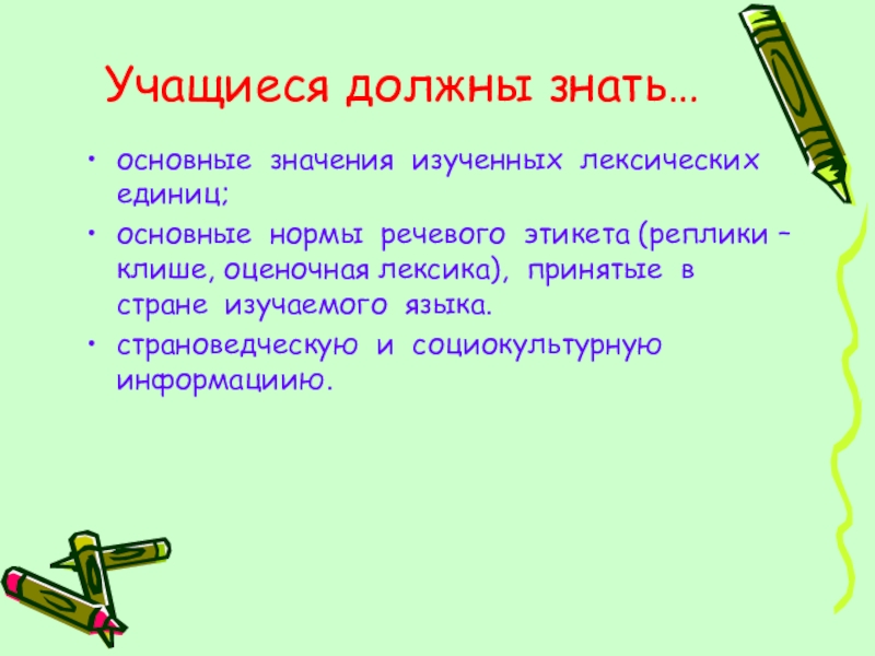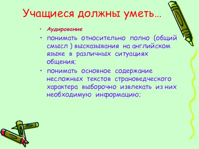 6). значительно расширить объём рецептивного и потенциального словаря, а так же грамматических явлений, которые школьники могли бы самостоятельно понять при чтении и в определённой мере при аудировании;